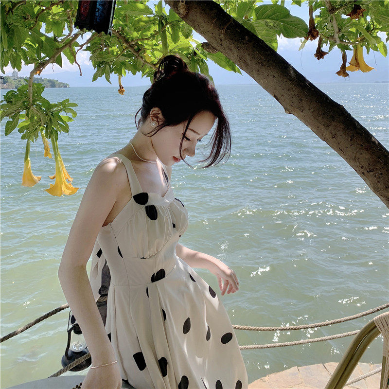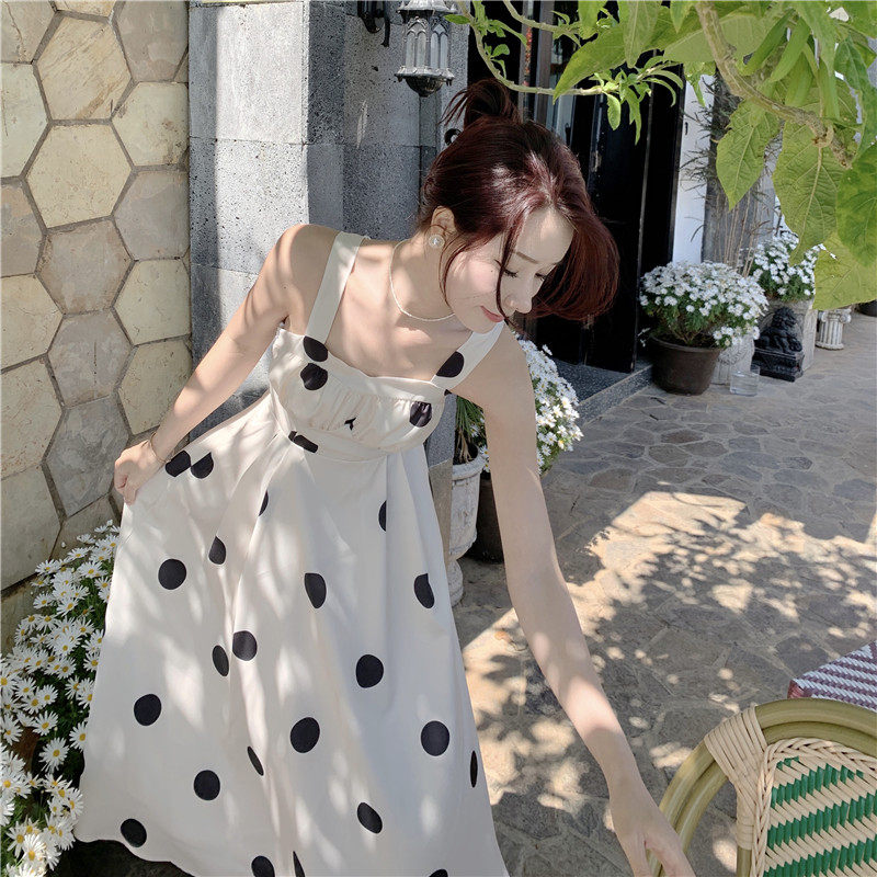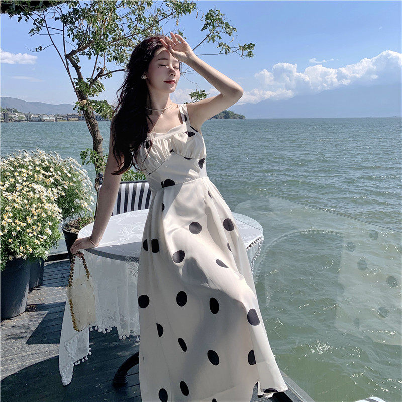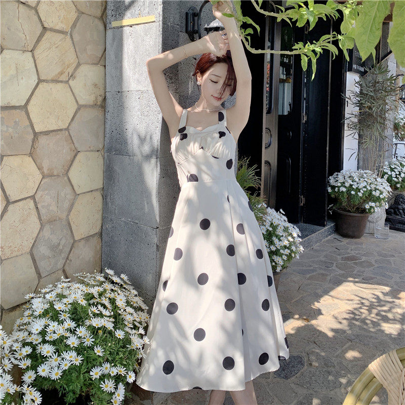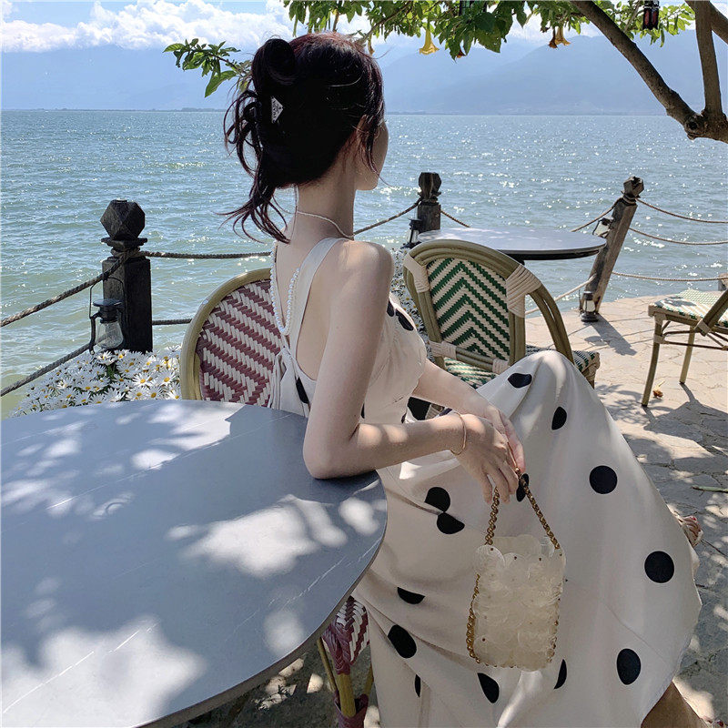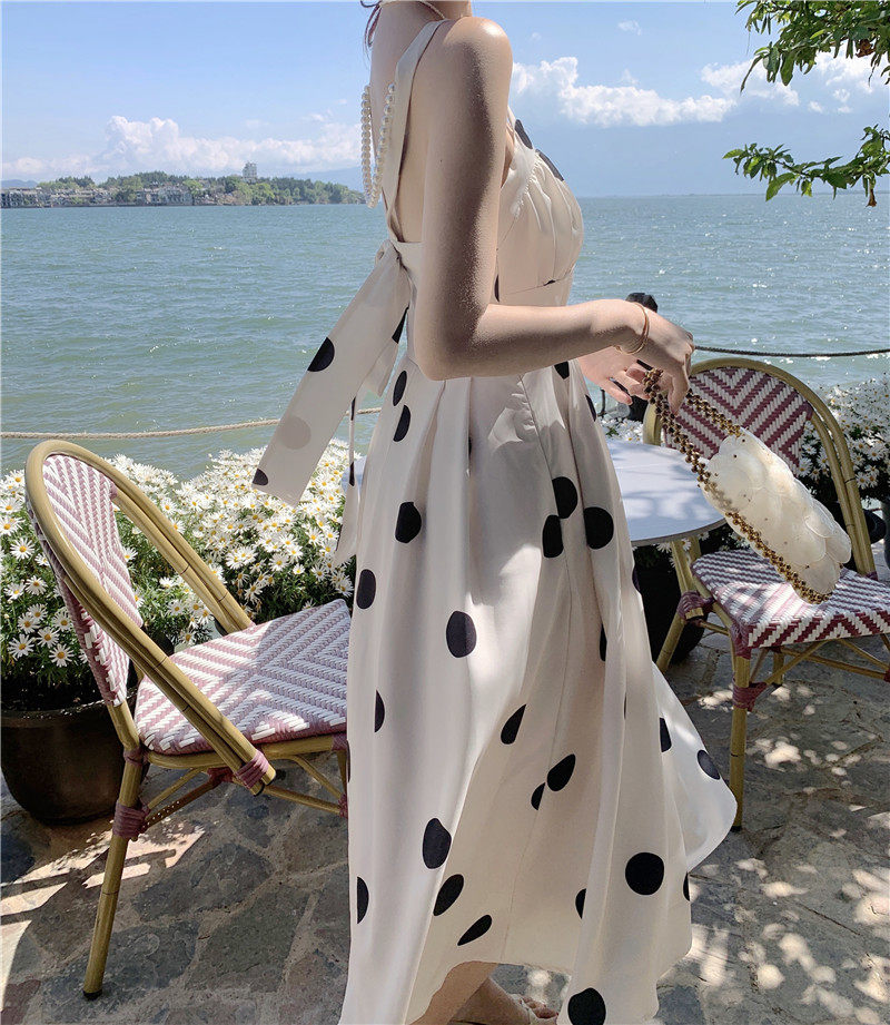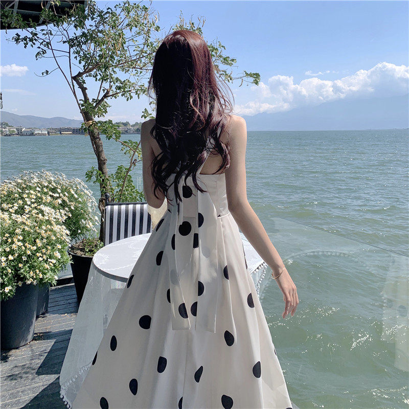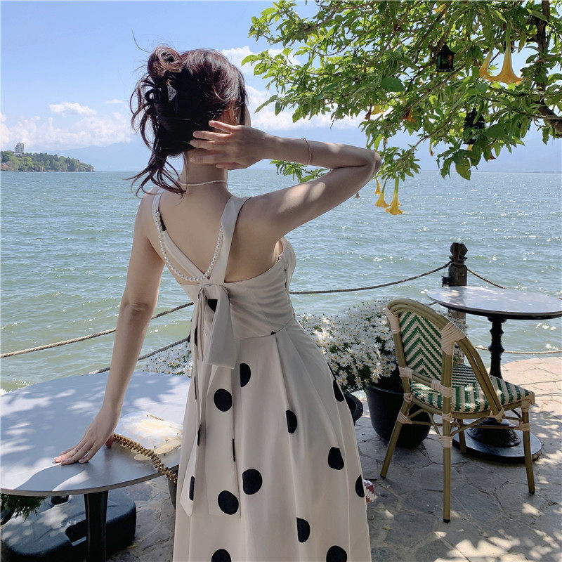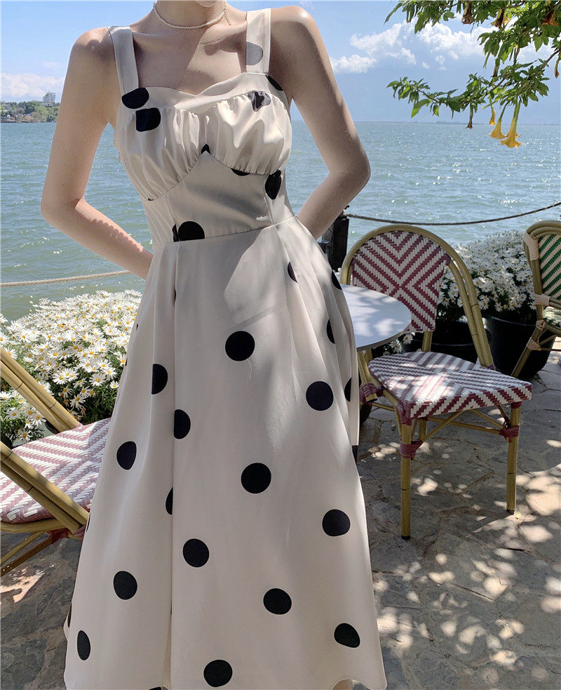 Women Open Back Polka Dot French Retro Spaghetti Straps Dress