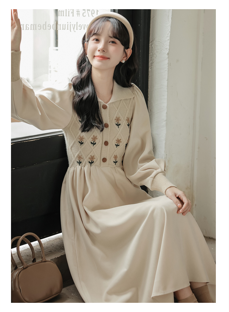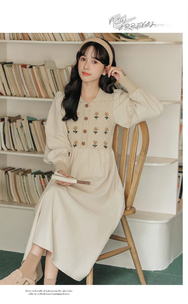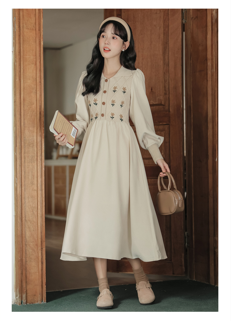 Dress Embroidery French Style Patchwork High Waist Puff Sleeve
